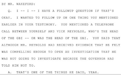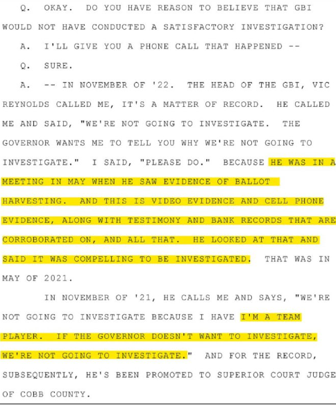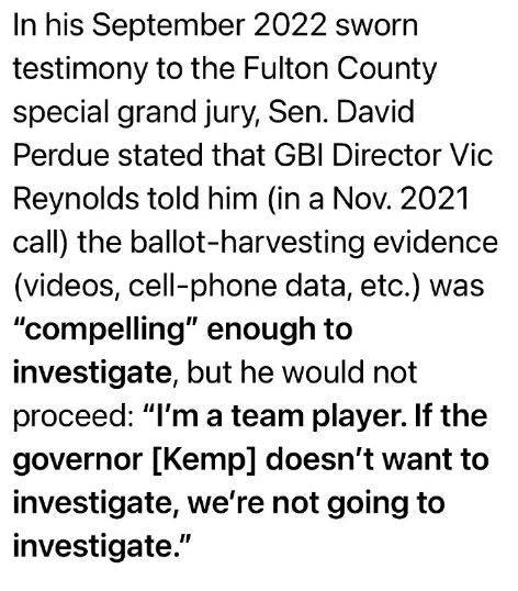 2022年9月、フルトン郡特別大陪審への宣誓証言の中で、デビッド・パーデュー上院議員は、GBI長官のヴィック・レイノルズ氏(2021年11月の電話)から、投票収集の証拠(動画、携帯電話のデータなど)は捜査するのに十分な「説得力」があると言われたものの、捜査を進めないと述べ、「私はチームプレーヤーです。もしケンプ知事が捜査を望まないのであれば、捜査は行いません」と付け加えた。