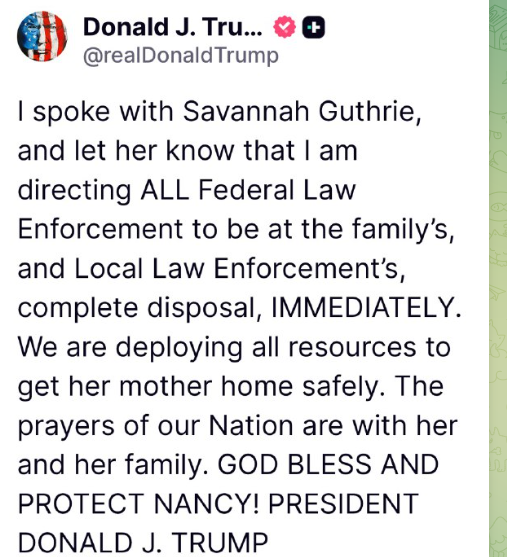 ホワイトハウスはソーシャルメディアのページにナンシー・ガスリーに関する情報を掲載し、人々に情報を報告するよう呼びかけた。[ 28 ] NBCのトム・リャマスとのインタビュー後、ドナルド・トランプ大統領は2026年2月4日にサバンナに電話をかけ、連邦政府の追加資源を提供するとともに、彼女の母親の無事な回復を祈った。[ 29 ]電話で、サバンナはトランプ大統領と法執行機関に感謝し、家族は悲嘆に暮れており祈っていると付け加えた。[ 30 ]