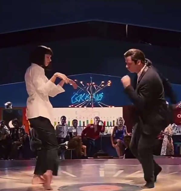 このシーンは、ヴィンセント・ベガ(ジョン・トラボルタ)とミア・ウォレス(ユマ・サーマン)が、ジャック・ラビット・スリムズというダイナーで開催されたツイスト・コンテストで踊っている様子です。