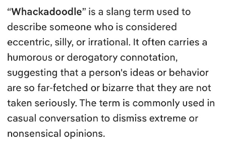 「Whackadoodle」は、風変わりな、愚かな、または非合理的な人物を表す俗語です。ユーモラスな意味合い、あるいは軽蔑的な意味合いを持つことが多く、人の考えや行動があまりにも突飛で奇抜であるため、真剣に受け止められないことを示唆します。この言葉は、日常会話の中で、極端または無意味な意見を退ける際によく使われます。