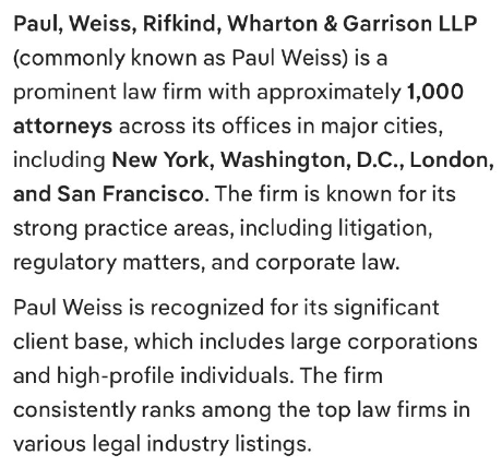 ポール・ワイス・リフキンド・ウォートン・アンド・ギャリソン法律事務所(通称ポール・ワイス)は、ニューヨーク、ワシントンD.C.、ロンドン、サンフランシスコなど主要都市にオフィスを構え、約1,000名の弁護士を擁する著名な法律事務所です。訴訟、規制関連事項、企業法務といった分野に強みを持つことで知られています。ポール・ワイスは、大企業や著名人を含む幅広い顧客基盤で知られています。また、様々な法律業界のランキングにおいて、常に上位にランクインしています。