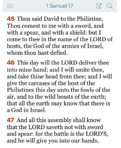 45節 ダビデはペリシテ人に言った。「お前は剣と槍と盾を持って私に襲いかかってくるが、私は万軍の主、イスラエルの軍勢の神、お前が挑んだ主の名によって、お前に立ち向かう。