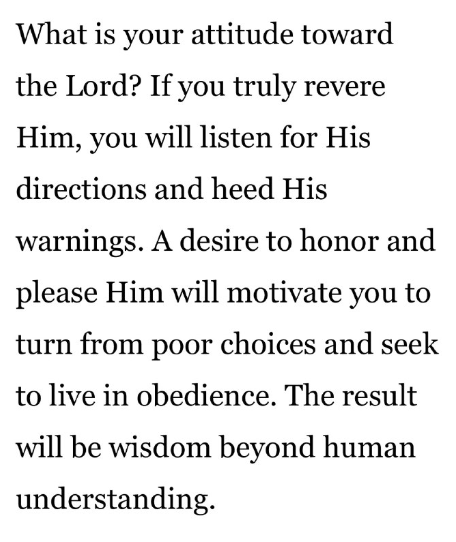 あなたは主に対してどのような態度を取っていますか?もしあなたが真に主を敬うなら、主の指示に耳を傾け、警告に耳を傾けるでしょう。主を敬い、喜ばせたいという願いは、誤った選択をやめ、従順に生きようと努める動機となるでしょう。その結果、人知を超えた知恵が生まれるでしょう。