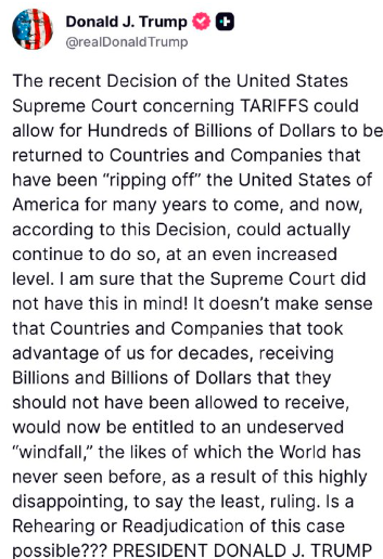最高裁判所はこのようなことを想定していなかったはずです。何十年にもわたってアメリカ合衆国を搾取し、本来受け取るべきではなかった数十億ドルもの金を受け取ってきた国や企業が、控えめに言っても非常に残念なこの判決によって、世界がかつて見たこともないような不当な「棚ぼた」を受け取る権利を得るというのは、全く理にかなっていません。この事件の再審理または再裁定は可能でしょうか?ドナルド・J・トランプ大統領