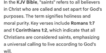 欽定訳聖書において、「聖徒」とは、神の目的のために召され、聖別された、キリストを信じるすべての人々を指します。この用語は、神聖さと道徳的な清さを意味します。重要な聖句には、ローマ人への手紙1章7節とコリント人への第一の手紙1章2節があり、これらはすべてのキリスト教徒が聖徒とみなされていることを示しており、神の御心に従って生きるという普遍的な召命を強調しています。