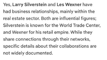 はい、ラリー・シルバースタイン氏とレス・ウェクスナー氏は、主に不動産業界でビジネス関係を築いてきました。両氏とも影響力のある人物で、シルバースタイン氏はワールドトレードセンター、ウェクスナー氏は小売業で知られています。二人はネットワークを通じて人脈を共有していますが、具体的な協力関係については、あまり文書化されていません。