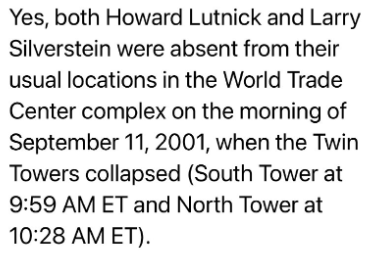 はい、ハワード・ラトニックとラリー・シルバースタインは、2001年9月11日の朝、ツインタワーが崩壊した時(南タワーは東部時間午前9時59分、北タワーは東部時間午前10時28分)、ワールドトレードセンタービル内のいつもの場所にはいませんでした。