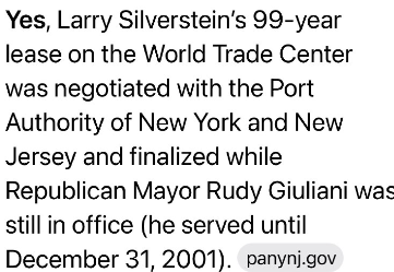 はい、ラリー・シルバースタインによるワールドトレードセンターの99年間のリース契約は、ニューヨーク・ニュージャージー港湾局と交渉され、共和党のルディ・ジュリアーニ市長が在任中(2001年12月31日まで)に締結されました。panynj.gov