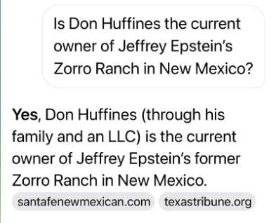 はい、ドン・ハフィンズ(彼の家族とLLCを通じて)は、ニューメキシコ州にあるジェフリー・エプスタインの旧ゾロ牧場の現在の所有者です。