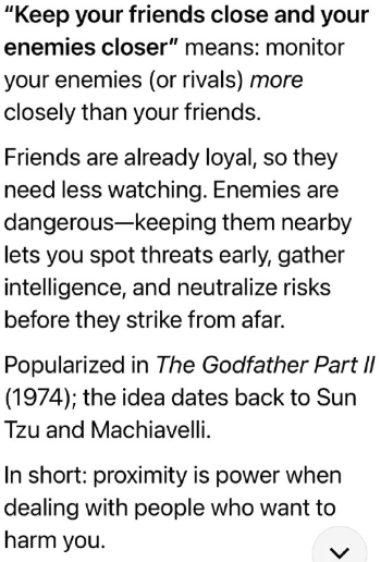 「友を近くに、敵をもっと近くに」とは、敵(またはライバル)を友よりも注意深く監視することを意味します。