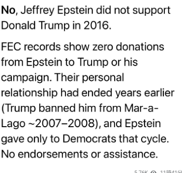 二人の個人的な関係は数年前に終わっていました(トランプ氏は2007年から2008年にかけて彼をマール・アー・ラーゴから追放しました)。そして、エプスタイン氏はその選挙期間中、民主党員にのみ寄付をしました。