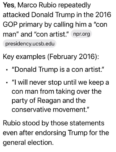 はい、マルコ・ルビオ氏(※現国務長官)は2016年の共和党予備選でドナルド・トランプ氏を「詐欺師」や「詐欺師」と呼んで繰り返し攻撃しました。npr.org