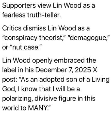 リン・ウッドは2025年12月7日のXへの投稿で、このレッテルを公然と受け入れた。「生ける神の養子として、私は自分がこの世界で多くの人にとって