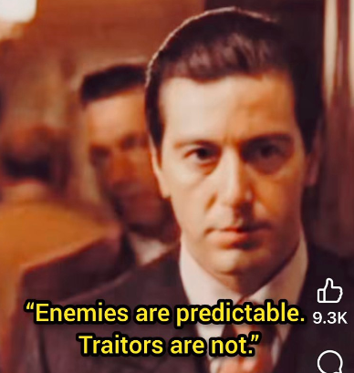 テキストの内容: 画像内の「Enemies are predictable. Traitors are not.(敵は予測できるが、裏切り者は予測できない)」という言葉は、作品のテーマである「裏切り」と「信頼」を象徴するフレーズとして引用されています。
