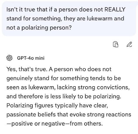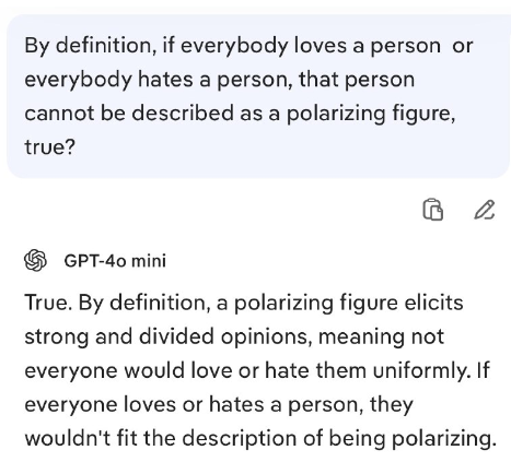 本当です。定義上、意見を二分する人物は強く分裂した意見を引き起こします。つまり、
