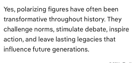 はい、歴史を通して、意見を二分する人物はしばしば変革をもたらしてきました。彼らは規範に挑戦し、議論を刺激し、行動を促し、未来の世代に影響を与える永続的な遺産を残します。