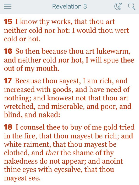 わたしはあなたの行いを知っている。あなたは冷たくもなく、熱くもない。わたしはあなたが冷たいか熱いかであってほしい。