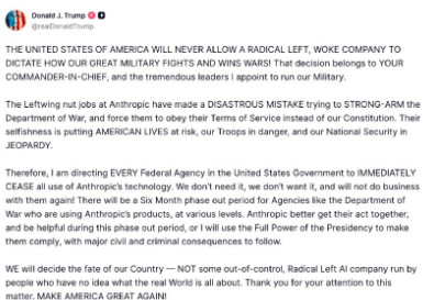 - 政治的非難: トランプ氏はAnthropicを「極左の意識高い系(Woke)企業」と非難し、同社が国防総省を脅迫しようとしたと主張しています。