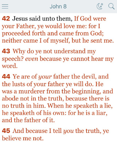 真理のうちにとどまりませんでした。彼のうちには真理がないからです。彼が偽りを語るとき、