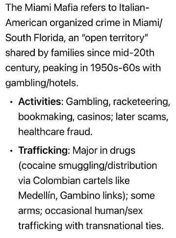 マイアミ・マフィアとは、マイアミ/南フロリダを拠点とするイタリア系アメリカ人の組織犯罪集団を指します。この地域は20世紀半ばから複数のファミリーが縄張りを共有してきた「オープンテリトリー」であり、1950年代から60年代にかけて賭博やホテル経営で最盛期を迎えました。