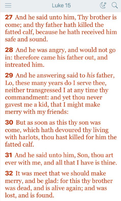 帰ってきたので、肥えた子牛を屠って祝ったのです。」