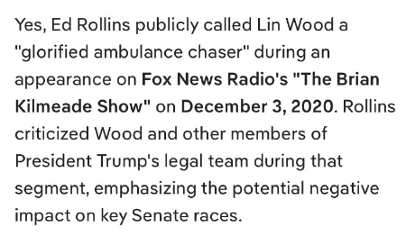 はい、エド・ロリンズ氏は2020年12月3日、Fox News Radioの「ブライアン・キルミード・ショー」に出演した際、リン・ウッド氏を「名ばかりの救急車追跡者」と公然と呼びました。ロリンズ氏はその番組の中で、ウッド氏とトランプ大統領の弁護団の他のメンバーを批判し、重要な上院選挙への潜在的な悪影響を強調しました。