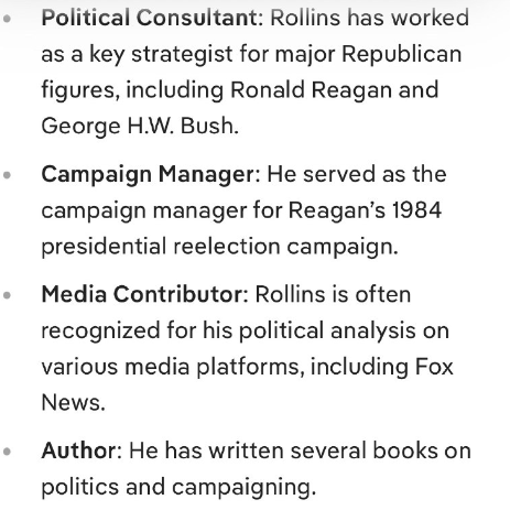 政治コンサルタント:ロリンズ氏は、ロナルド・レーガン氏やジョージ・H・W・ブッシュ氏をはじめとする共和党の主要人物の主要戦略家として活躍しました。