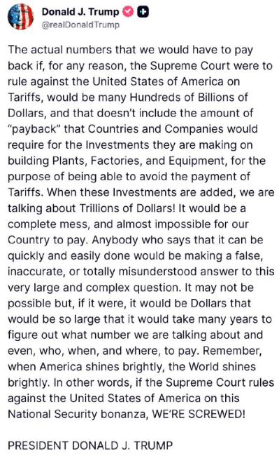 もし何らかの理由で最高裁判所がアメリカ合衆国に関税を課す判決を下した場合、実際に返済しなければならない金額は数千億ドルに上ります。しかも、これには関税の支払いを回避するために国や企業が工場や設備の建設に投資した費用に対する「回収」額は含まれていません。これらの投資も加えると、数兆ドルにも上ります!これは完全な混乱を招き、我が国が返済するのはほぼ不可能でしょう。