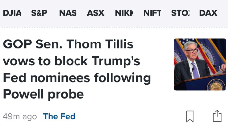 トム・ティリス上院議員(共和党・ノースカロライナ州選出)は、司法省がジェローム・パウエル議長を偽証罪の可能性で捜査していることが明らかになったことを受けて、議長候補を含むトランプ氏の連銀理事会の指名を阻止すると述べた。