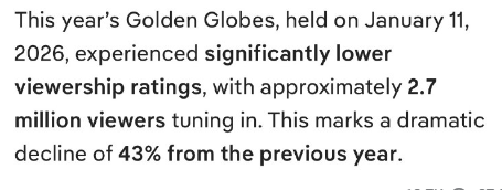 2026年1月11日に開催された今年のゴールデングローブ賞は、視聴者数が前年比で43%減という大幅な減少となり、約270万人にとどまりました。