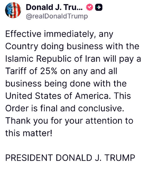 即時発効、イラン・イスラム共和国(※イランの正式名)と取引のある国は、アメリカ合衆国と行うあらゆる取引に対して25%の関税を支払うことになります。