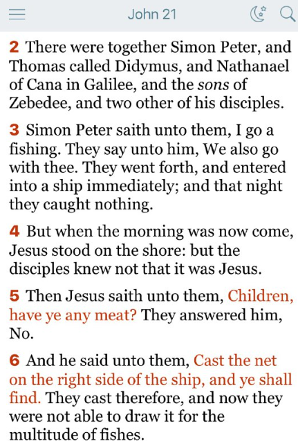 6 そこでイエスは言われた。「舟の右側に網を投げなさい。そうすれば、とれるでしょう。」彼らは網を投げたが、魚が多くて、もう引き上げることができなかった。