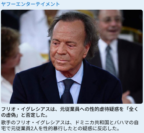 「このような悪意は経験したことがなかった」とAP通信によると、82歳の歌手は付け加えた。「しかし、私はまだ、人々に真実をすべて知ってもらい、このような深刻な侮辱から自分の尊厳を守る強さを持っている」スペインの検察当局は、今週メディアで報じられたイグレシアス氏に対する疑惑について調査中であると発表した。スペインのオンライン紙「エルディアリオ・エス」とスペイン語テレビ局「ユニビジョン・ノティシアス」は今週、新型コロナウイルス感染症(COVID-19)のパンデミックが続く中、2021年1月から10月にかけて、イグレシアス氏がカリブ海にある彼の自宅で住み込みで働いていたと主張する元従業員2名の女性に対し、性的暴行と身体的暴行を加えたという疑惑について、共同調査報告書を発表した。