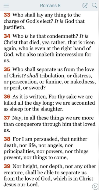 38 わたしは確信しています。死も、いのちも、天使も、支配者も、力ある者も、今あるものも、これから来るものも、39 高い所も、深い所も、そのほかのどんな被造物も、わたしたちの主キリスト・イエスにある神の愛から、わたしたちを引き離すことはできません。