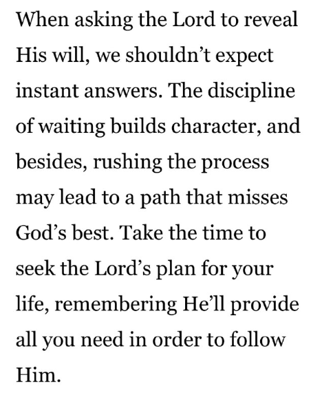 主に御心を明らかにしてくださるよう求めるとき、すぐに答えが得られると期待すべきではありません。待つという鍛錬は人格を育みます。それに、そのプロセスを急ぐと、神の最善を見失う道につながる可能性があります。時間を取って、あなたの人生における主の計画を求め、主に従うために必要なものはすべて与えてくださることを覚えておきましょう。