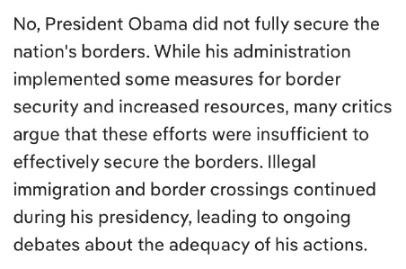 いいえ、オバマ大統領は国境を完全に守ったわけではありません。政権は国境警備のためのいくつかの措置を講じ、資源を増強しましたが、多くの批評家は、これらの努力は国境を効果的に守るには不十分だったと主張しています。不法移民と国境越えはオバマ大統領の任期中も続き、彼の行動の妥当性について議論が続いています。