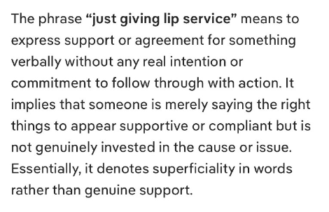 「口先だけの」という表現は、何かに対する支持や同意を、実際に行動に移す意図や約束もなく、言葉だけで表明することを意味します。これは、誰かが単に支持や従順さを装うために適切な言葉を述べているだけで、その原因や問題に真剣に取り組んでいないことを意味します。本質的には、真の支持ではなく、言葉の上辺だけの表現を意味します。