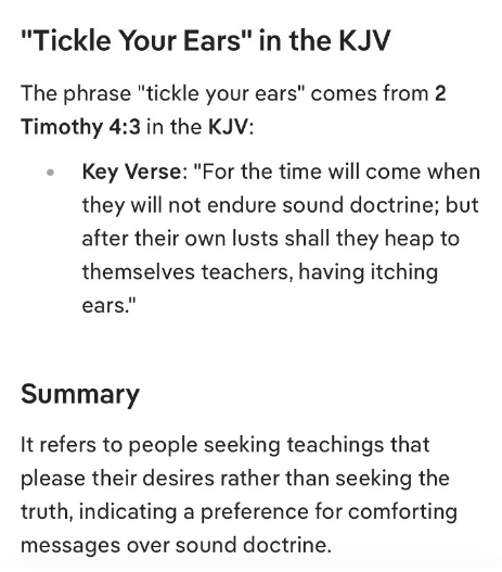 「あなたの耳をくすぐる」という表現は、欽定訳聖書のテモテへの手紙二4章3節に由来しています。