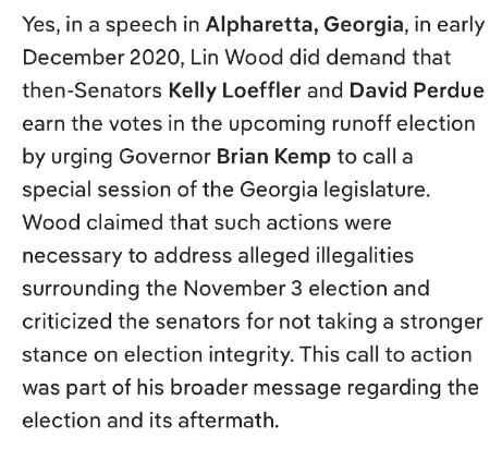 はい、2020年12月初旬、ジョージア州アルファレッタでの演説で、リン・ウッド氏は、当時上院議員だったケリー・レフラー氏とデビッド・パーデュー氏に対し、ブライアン・ケンプ知事にジョージア州議会の特別会期の招集を促し、来たる決選投票で票を獲得するよう求めました。ウッド氏は、11月3日の選挙をめぐる違法行為の疑いに対処するために、こうした行動は必要だと主張し、上院議員たちが選挙の公正性に関してより強硬な姿勢を取らなかったことを批判しました。この行動の呼びかけは、選挙とその余波に関するウッド氏のより広範なメッセージの一部でした。