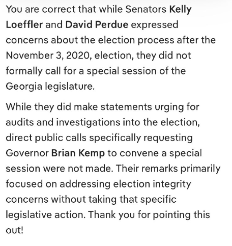 ケリー・レフラー上院議員とデビッド・パーデュー上院議員は、2020年11月3日の選挙後、選挙プロセスについて懸念を表明したものの、ジョージア州議会の特別会期を正式に招集しなかったのは事実です。選挙の監査と調査を求める声明は発表しましたが、ブライアン・ケンプ知事に特別会期の招集を具体的に求める直接の呼びかけは行われませんでした。彼らの発言は、具体的な立法措置を講じることなく、選挙の公正性に関する懸念に対処することに重点を置いていました。ご指摘ありがとうございます。