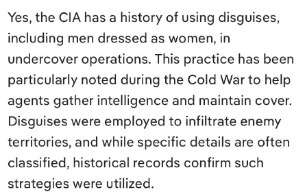 はい、CIAは潜入捜査において、女性の服装を含む変装を用いた歴史があります。この慣行は、特に冷戦時代に、諜報員が情報収集と身元隠蔽を維持するために用いられたことで注目されました。変装は敵地への潜入に用いられ、具体的な詳細はしばしば機密扱いされていますが、歴史的記録は、そのような戦略が用いられたことを裏付けています。