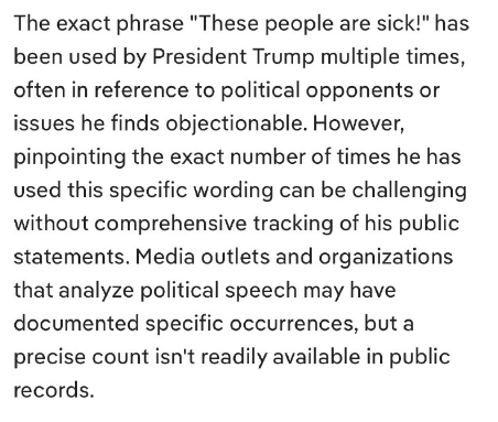 「この人たちは病んでいる!」というフレーズは、トランプ大統領によって何度も使用されており、多くの場合、政敵や彼が問題視する問題について言及されています。しかし、彼の公の発言を包括的に追跡しなければ、この特定の表現を彼が使用した正確な回数を特定することは困難です。政治的発言を分析するメディアや組織は、具体的な事例を記録しているかもしれませんが、正確な回数は公の記録から容易に入手できません。
