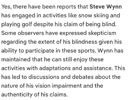 はい、スティーブ・ウィン氏は、視覚障害があると主張しているにもかかわらず、スキーやゴルフなどのスポーツに取り組んでいるという報道があります。一部の観察者は、これらのスポーツに参加できる能力を考えると、彼の失明の程度に疑問を呈しています。ウィン氏は、補助や調整があればこれらのスポーツを今でも楽しめると主張しています。このため、彼の視覚障害の性質と、彼の主張の信憑性について議論が交わされています。