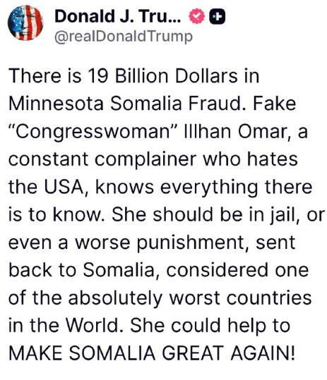 偽物の「下院議員」イルハン・オマールはアメリカを憎み、常に不満を漏らす人物だが、あらゆることを知っている。彼女は刑務所に入れられるべきだ。