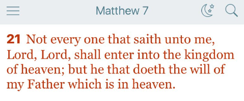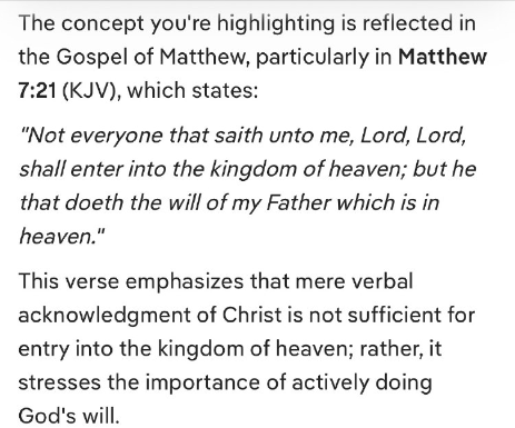 あなたが強調している概念は、マタイによる福音書、特にマタイによる福音書7章21節(欽定訳)に反映されています。「わたしに向かって『主よ、主よ』と言う者がみな天の御国に入るのではなく、天にいますわたしの父の御心を行う者が入るのである。」