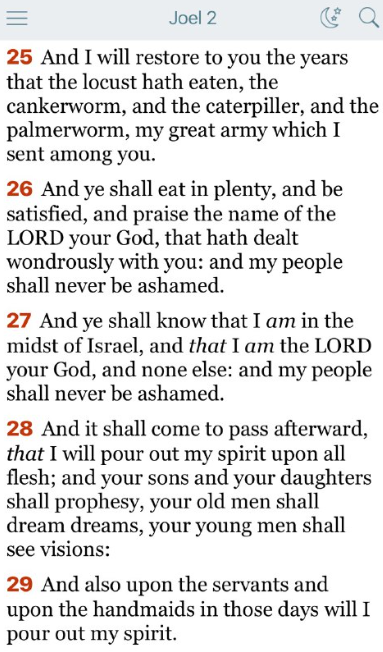その後、わたしはすべての肉なる者の上にわたしの霊を注ぐ。あなたがたの息子、娘は預言し、あなたがたの老人は夢を見、あなたがたの若者は幻を見るであろう。