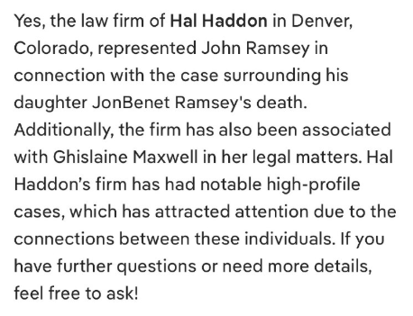 はい、コロラド州デンバーのハル・ハッドン法律事務所は、ジョン・ラムジー氏の娘ジョンベネット・ラムジー氏の死亡事件で、同氏の代理人を務めました。