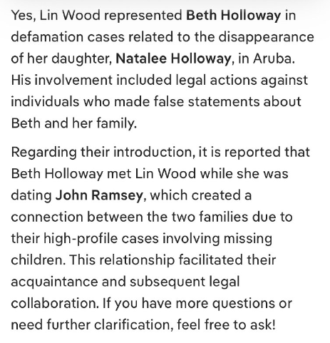 はい、リン・ウッドは、アルバ島で娘のナタリー・ホロウェイさんが失踪した事件に関連する名誉毀損訴訟で、ベス・ホロウェイさんの代理人を務めました。