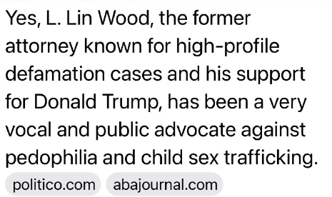 そうです。L・リン・ウッド氏は、著名な名誉毀損訴訟やドナルド・トランプ氏への支持で知られる元弁護士で、小児性愛や児童性的人身売買に反対する声を強く上げてきました。