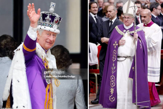 教皇は重要な行事の際には王家の色である紫を着ることが多く、赤はカトリックの枢機卿の法衣の色です。
